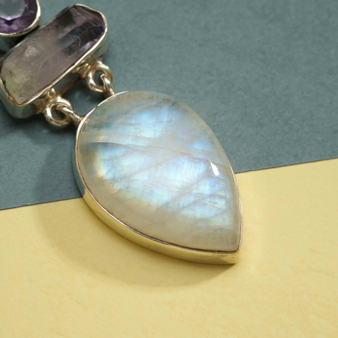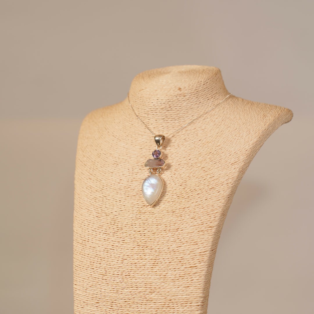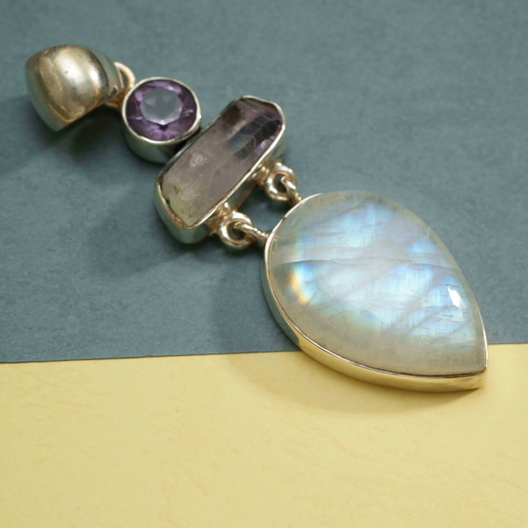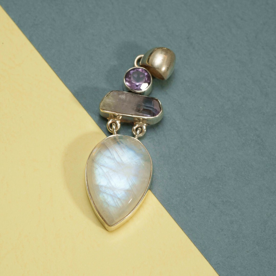 切割面紫水晶原礦紫水晶月光石鑲框墜飾