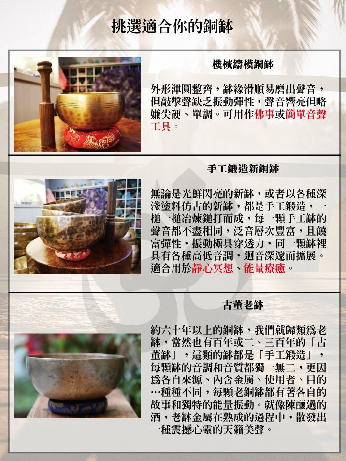 既然是手工錘煉的銅缽,嚴格說來… 每顆外觀、音頻、振動都獨一無二,不同的個性唱出不同的歌我們的西藏銅缽,是專業頌缽教師親赴尼泊爾尋覓喜瑪拉雅山麓的工廠,在一片缽海中精挑細選,顆顆都是療癒極品歡迎親至門市體驗… 我們也會現場教您簡單的使用方式~
