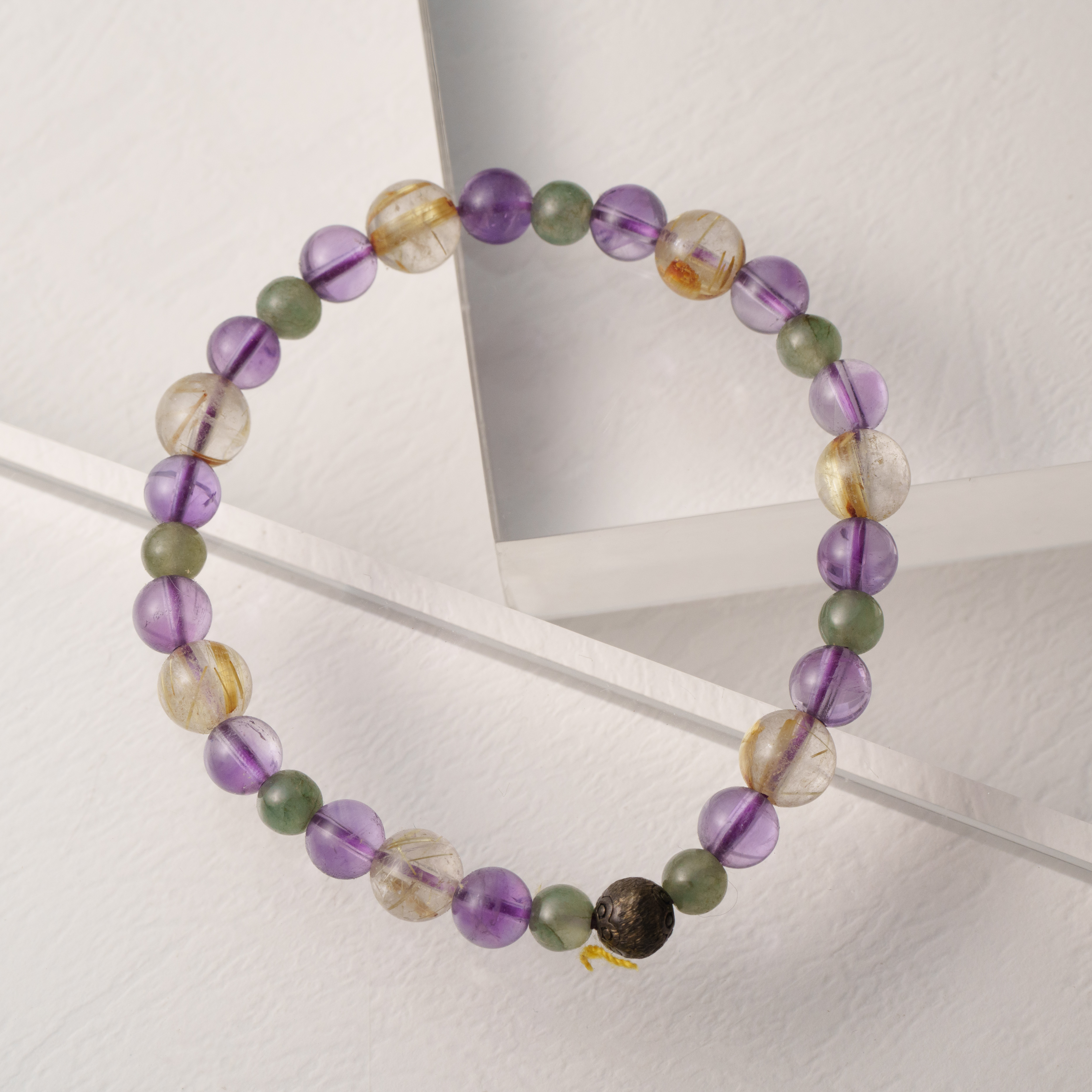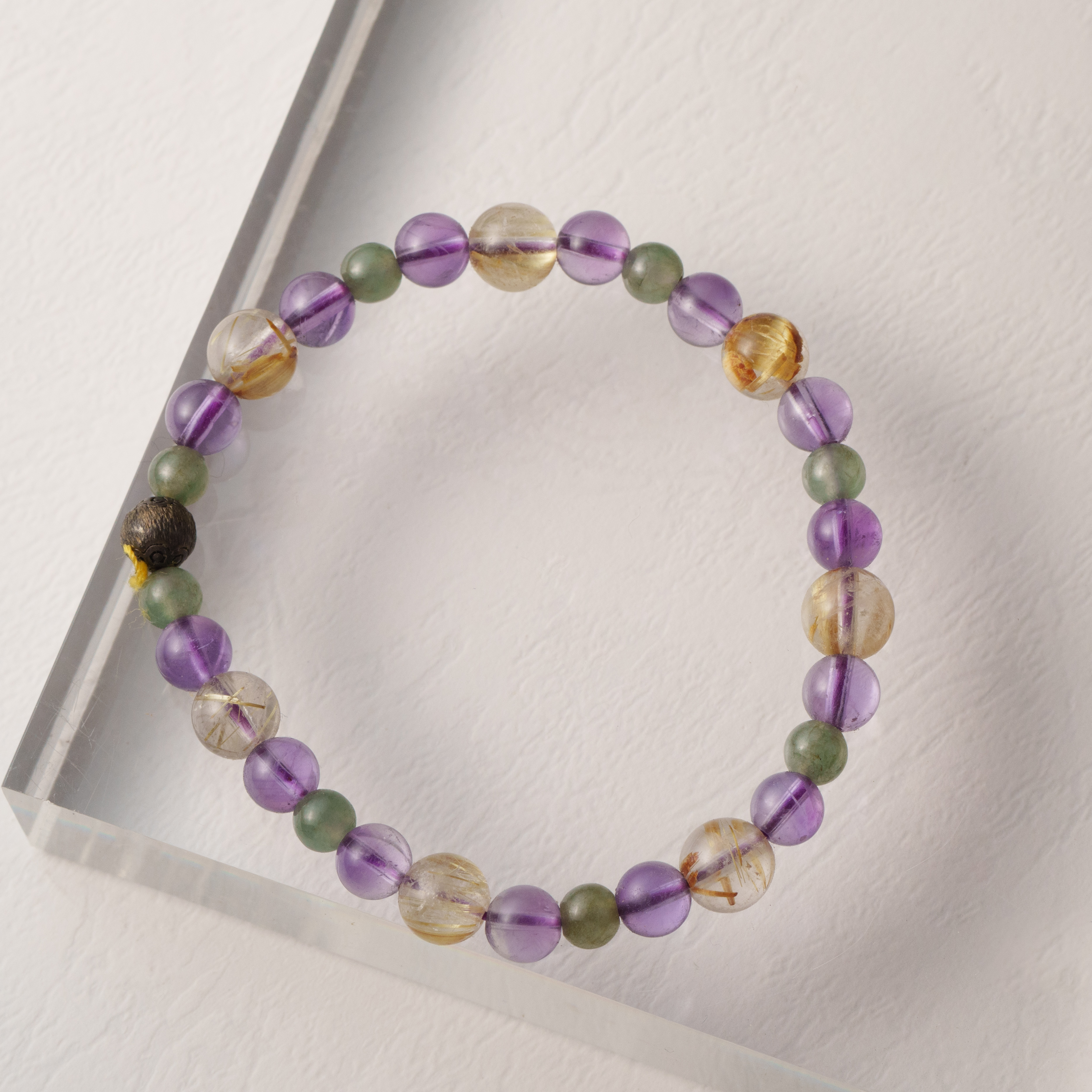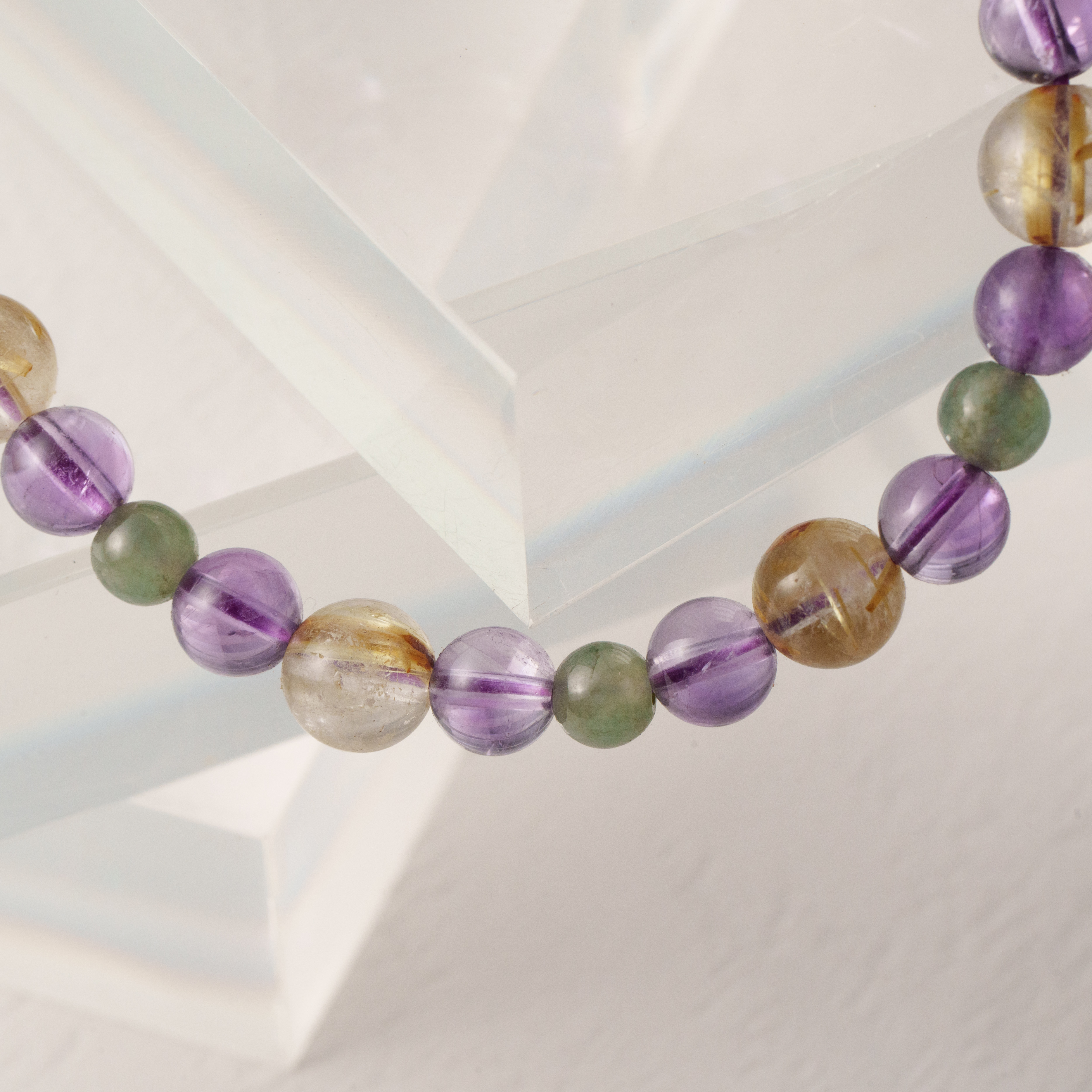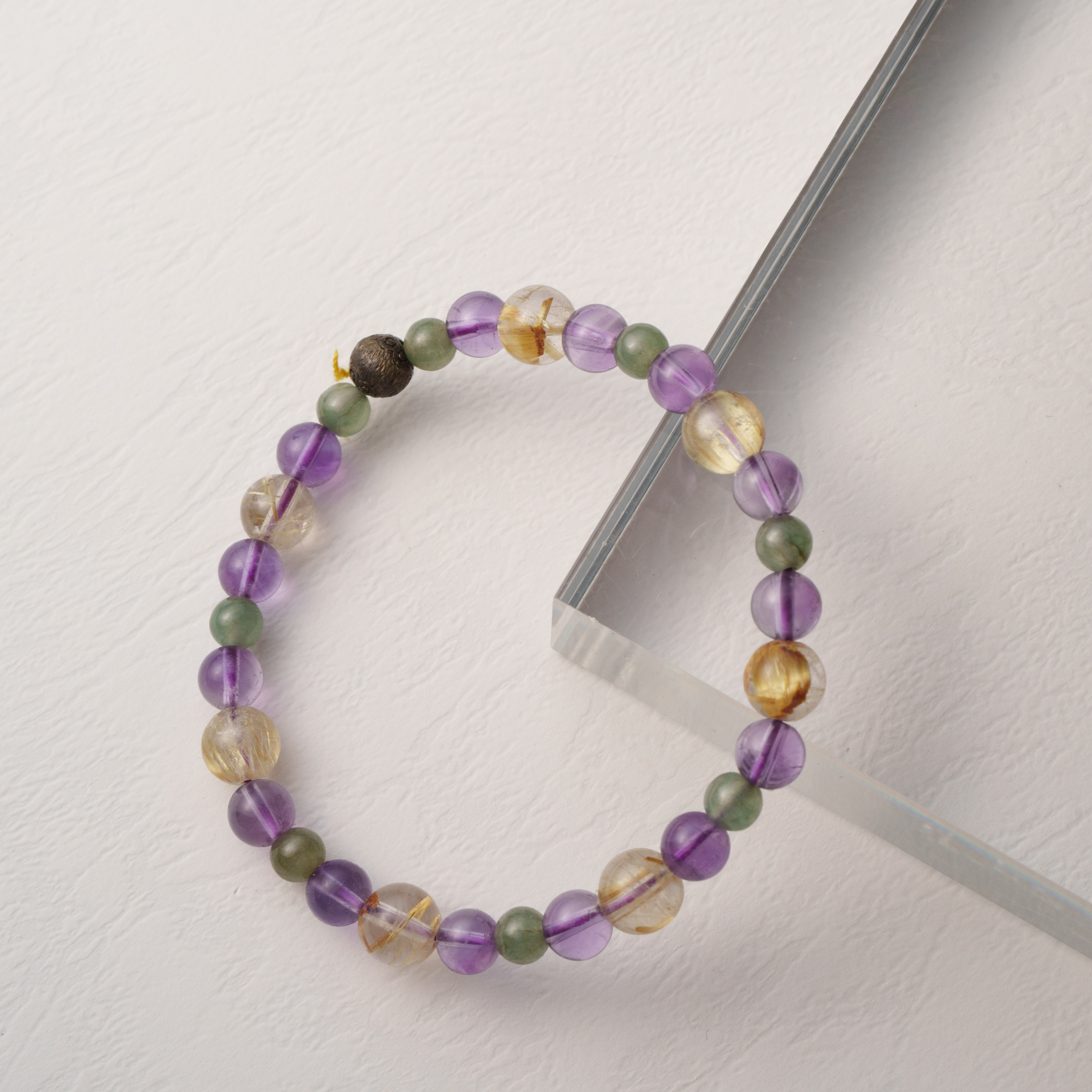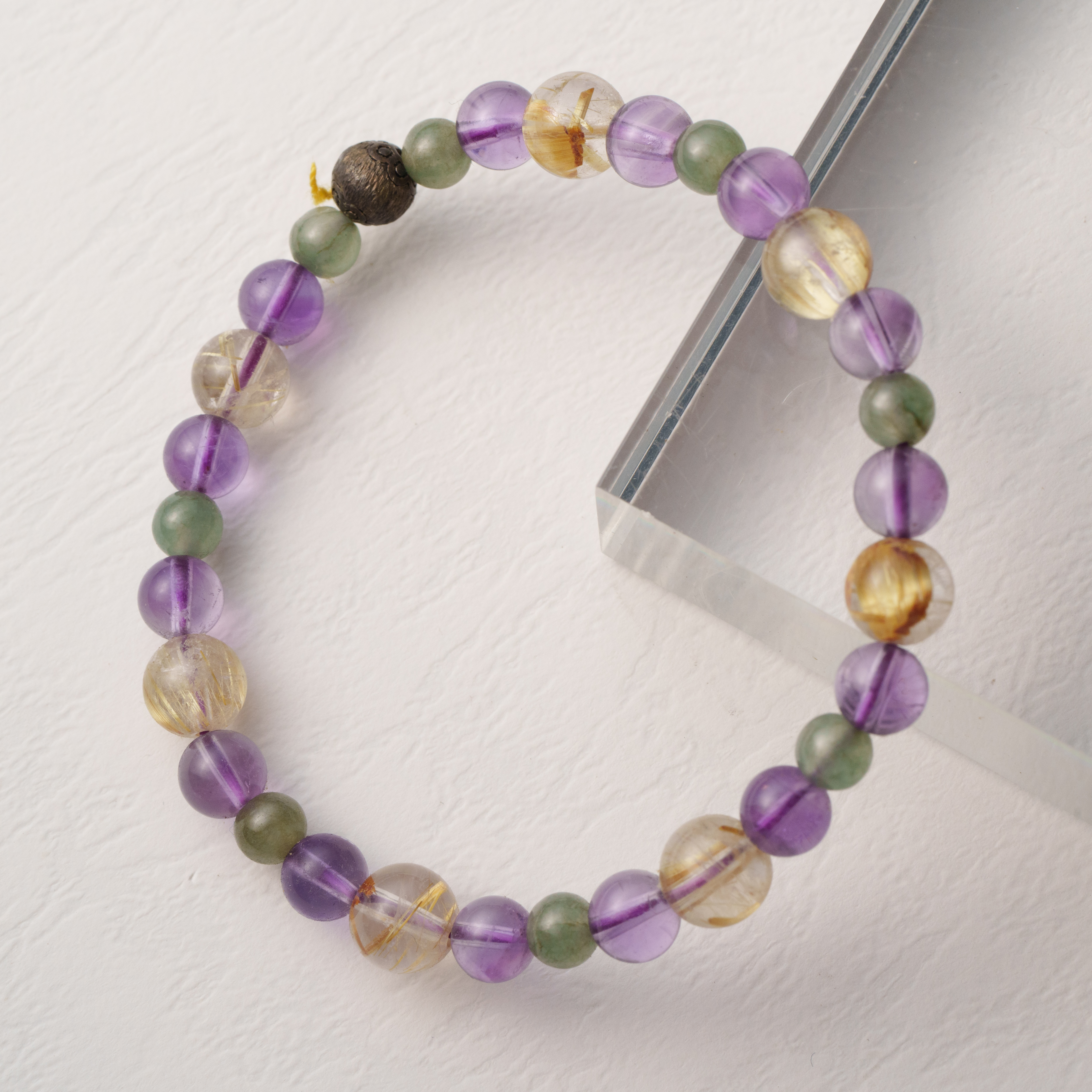 鈦晶手珠每顆約7~8mm,紫水晶手珠每顆約6~7mm,東菱玉手珠每顆約5mm